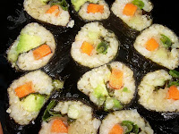 Bolas de arroz fritas y envueltas en nori, nishime de verduras con tofu, ensalada de salteado rápido de coles y pickles con vinagre de arroz.jueves, 28 de octubre de 2010