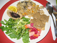 Arroz a presión con semillas de sésamo, seitán a la naranja, arame con cebollas y aceitunas negras y brócoli ligeramente hervido con pickles de lombarda con aliño de aceite de sésamo y vinagre de umeboshi.