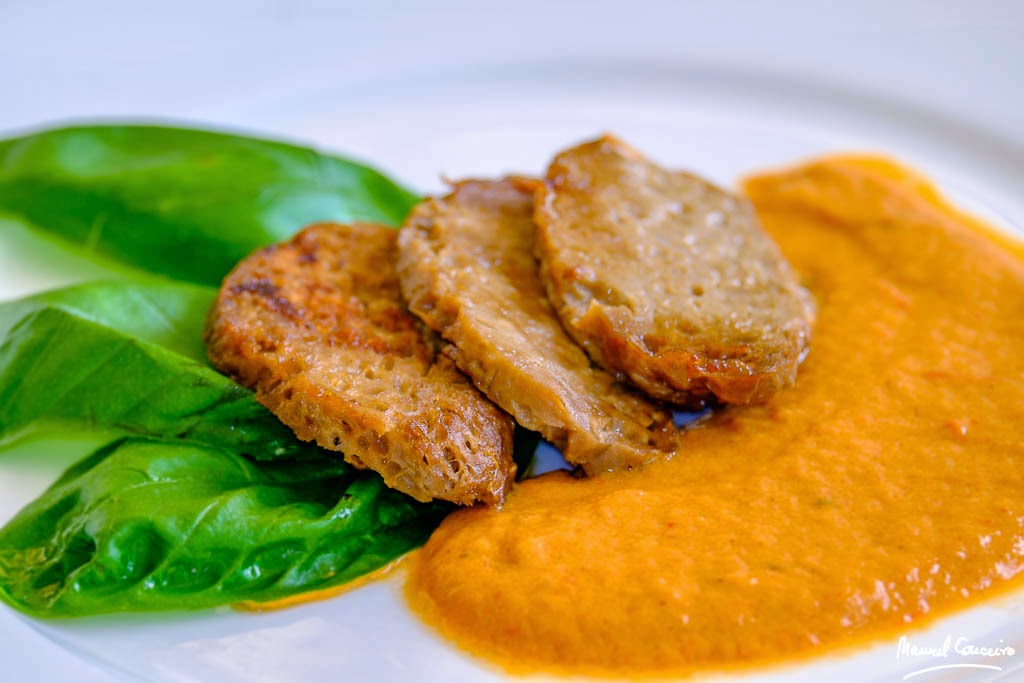 - Por último fileteamos el seitán y lo hacemos a la plancha con un poquito de aceite de oliva.